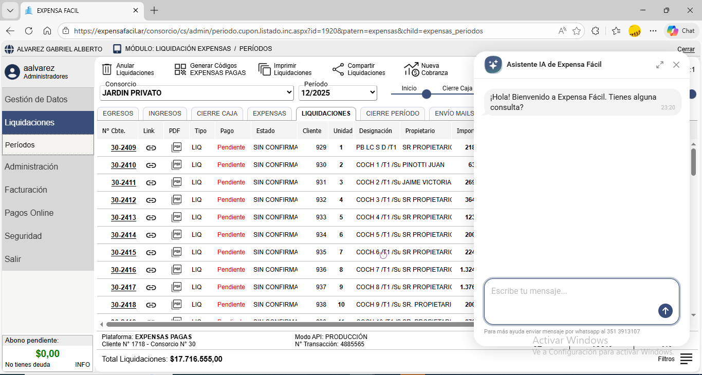 ¡Así es! Expensa Fácil es un sistema de gestión completo que te ayuda en todo el proceso de lquidación de expensas y en las etapas posteriores, como por ejemplo Cobranzas Manuales, Mayorización de Ingresos y Gastos, Gestión de Deudores Morosos, Conciliación de Pagos y Comisiones y mucho mas.